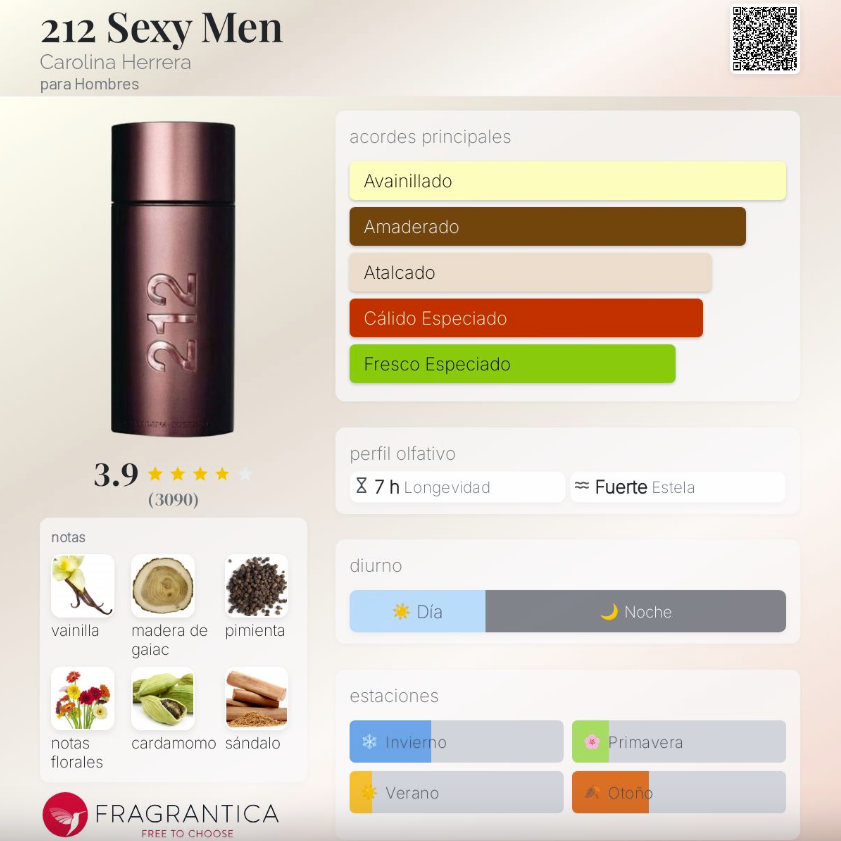 212 Sexy Men de Carolina Herrera es una fragancia masculina lanzada en 2006, perteneciente a la familia Oriental Fougère. Es un perfume urbano, sofisticado y profundamente seductor, pensado para hombres seguros que buscan proyectar una presencia cálida y envolvente. Su salida combina mandarina, bergamota y notas verdes, creando un inicio fresco y chispeante. En el corazón, la pimienta, las flores y el cardamomo aportan un toque especiado y ligeramente dulce, muy característico de su sensualidad moderna. Finalmente, su fondo de vainilla, madera de gaiac, sándalo, almizcle y ámbar deja una estela cálida, cremosa y adictiva, perfecta para las noches.