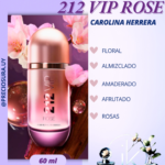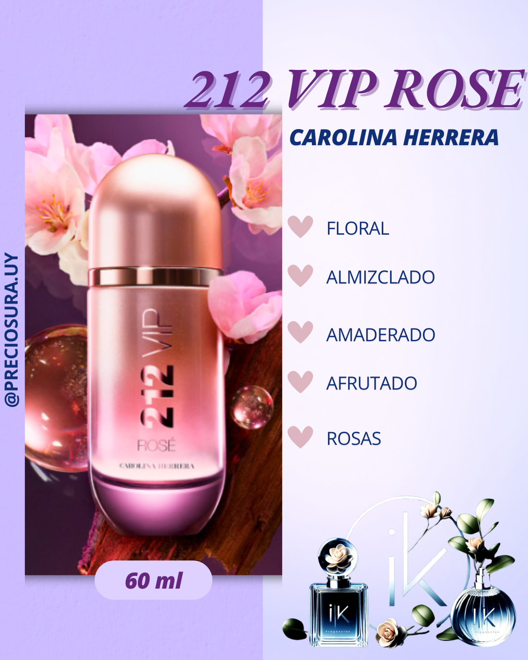 212 VIP Rosé de Carolina Herrera es una fragancia de la familia olfativa Floral Frutal para Mujeres. 212 VIP Rosé se lanzó en 2014. La Nariz detrás de esta fragrancia es Lucas Sieuzac. Las Notas de Salida son Champagne Rosé y pimienta rosa; las Notas de Corazón son flor del duraznero (flor del melocotonero) y rosa; las Notas de Fondo son almizcle blanco y notas amaderadas.