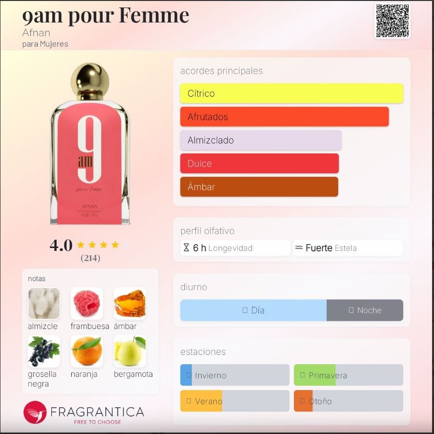 9AM Pour Femme de Afnan es una fragancia femenina lanzada en 2022, perteneciente a la familia Oriental. Inspirada en My Way de Giorgio Armani, combina elegancia, frescura y un toque moderno que la hace ideal para el uso diario. Su salida brillante de bergamota, toronja y mandarina abre con energía y vitalidad, dando paso a un corazón frutal de frambuesa y grosellas negras. El fondo de almizcle, ámbar y naranja añade suavidad, calidez y sensualidad, logrando una fragancia femenina, versátil y encantadora.