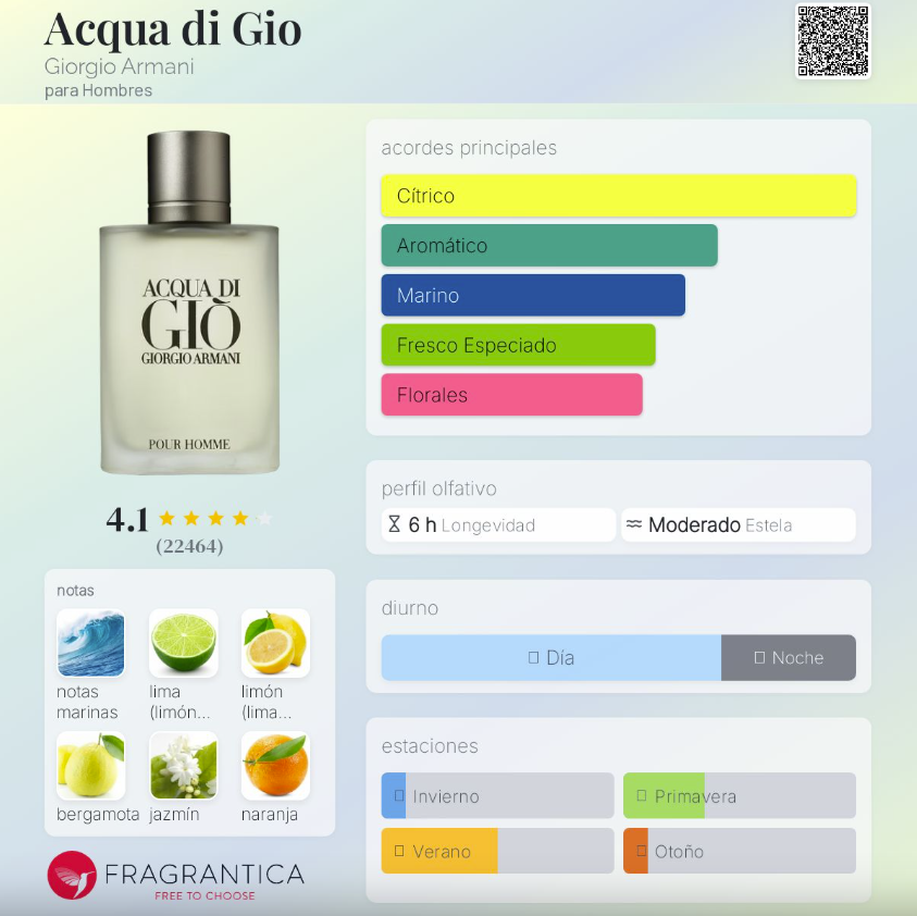 Acqua di Gio de Giorgio Armani es una fragancia masculina lanzada en 1996, perteneciente a la familia Aromática Acuática. Creada por Alberto Morillas, Annick Menardo y Christian Dussoulier, es un verdadero clásico que combina frescura, naturalidad y elegancia mediterránea. Su apertura cítrica y luminosa mezcla lima, limón, bergamota, jazmín, naranja, mandarina y neroli, dando un inicio vibrante y limpio. En el corazón, las notas marinas se combinan con un amplio bouquet floral y especiado, generando un aroma equilibrado y refrescante. Su fondo de almizcle blanco, cedro, musgo de roble, pachulí y ámbar aporta profundidad, sensualidad y una estela sutil pero persistente.