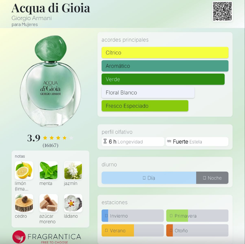 Acqua di Gioia de Giorgio Armani es una fragancia femenina lanzada en 2010, perteneciente a la familia Floral Acuática. Creada por los perfumistas Loc Dong, Anne Flipo y Dominique Ropion, es un perfume fresco, luminoso y natural, inspirado en la pureza del agua y la energía revitalizante de la naturaleza. Su salida mezcla limón de Amalfi y menta, creando un inicio chispeante, refrescante y lleno de vitalidad. En el corazón, el jazmín de agua aporta un carácter floral acuático suave y elegante. Finalmente, su fondo combina cedro de Virginia, azúcar moreno y ládano francés, dejando una estela limpia, ligeramente dulce y muy equilibrada.