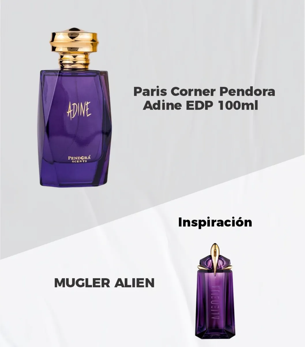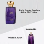 Adine de Pendora Scents es una fragancia femenina perteneciente a la familia Oriental Floral, lanzada durante los años 2020. Es un perfume intenso, misterioso y muy envolvente, inspirado en Alien de Mugler. Su composición minimalista pero poderosa destaca el carácter luminoso del jazmín sambac, que aporta un inicio floral brillante y seductor. En el corazón, la madera de cachemira suma calidez y elegancia. Finalmente, el fondo de ámbar blanco deja una estela profunda, sensual y muy duradera.