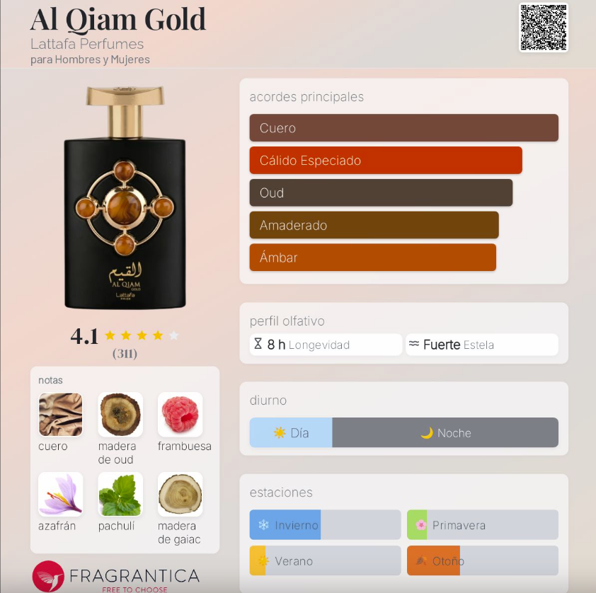 Al Qiam Gold de Lattafa Perfumes es una fragancia unisex lanzada en 2022, perteneciente a la familia Amaderada Oriental. Es una composición intensa, lujosa y envolvente que combina notas dulces, especiadas y amaderadas en un equilibrio perfecto entre elegancia y carácter. Su apertura mezcla la jugosidad de la frambuesa con el exotismo del azafrán, creando un inicio sofisticado y vibrante. En el corazón, el cuero y el pachulí aportan profundidad, sensualidad y un toque oscuro. Finalmente, el fondo revela un acorde opulento de madera de oud, gaiac, benjuí, ámbar y vetiver, dejando una estela cálida, ambarada y poderosa. Ideal para quienes buscan un perfume de presencia fuerte y refinada.