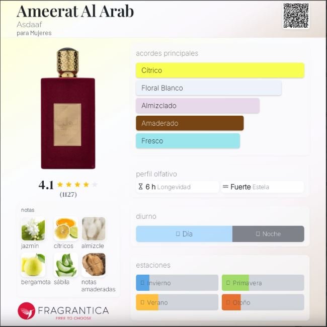 Ameerat Al Arab de Asdaaf, lanzado en 2022, es una fragancia femenina de la familia Floral. Su aroma combina frescura cítrica con un corazón almizclado y un fondo floral-amaderado con presencia de oud, logrando un equilibrio entre lo moderno y lo tradicional.