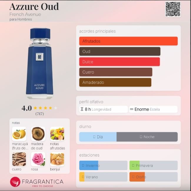 Azzure Oud, de la casa French Avenue, es una fragancia masculina de la familia oriental, lanzada en 2024, reconocida como un dupe del exclusivo Oud Maracuyá de Maison Crivelli. Su apertura vibrante y exótica combina maracuyá, acordes afrutados, rosa y azafrán, creando un inicio jugoso y especiado. En el corazón, la intensidad de la madera de oud se mezcla con la profundidad del benjuí y el pachulí, aportando calidez y carácter. Finalmente, la base revela un fondo elegante y poderoso con cuero, madera de gaiac, vainilla, ámbar, cedro, sándalo y ládano, dejando una estela rica, envolvente y sofisticada.
