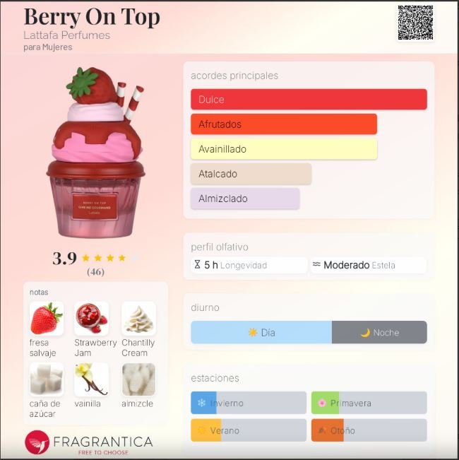Berry On Top de Lattafa Perfumes es una fragancia femenina lanzada en 2025, perteneciente a la familia Floral Frutal Gourmand. Creada por la perfumista Dalia Izem, es una composición dulce, cremosa y alegre que evoca un postre recién preparado con frutos rojos. Su salida combina la frescura jugosa de la fresa con la suavidad cremosa del chantilly. En el corazón, la mermelada de fresa se mezcla con azúcar y flores blancas, aportando una sensación golosa y delicada. Finalmente, el fondo de vainilla y almizcle otorga calidez y sensualidad, envolviendo la piel con una estela adictiva y femenina.