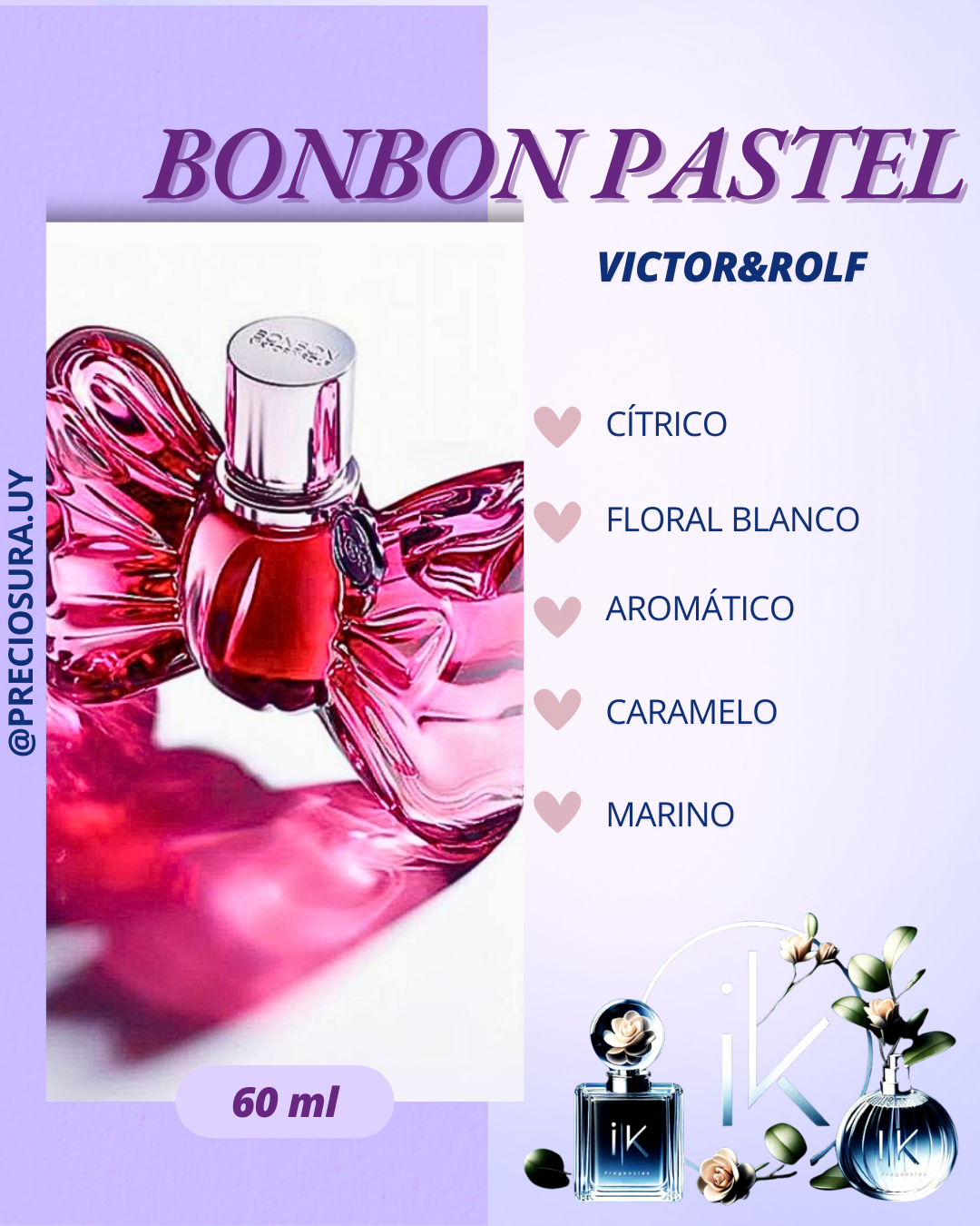 Bonbon Pastel de Viktor&Rolf es una fragancia de la familia olfativa Floral Frutal Gourmand para Mujeres. Bonbon Pastel se lanzó en 2019. Bonbon Pastel fue creada por Cecile Matton y Serge Majoullier. Las Notas de Salida son mandarina, bergamota y cardamomo; las Notas de Corazón son notas marinas, flor de azahar del naranjo y neroli; las Notas de Fondo son caramelo, ámbar, almizcle y sándalo.