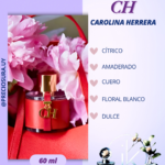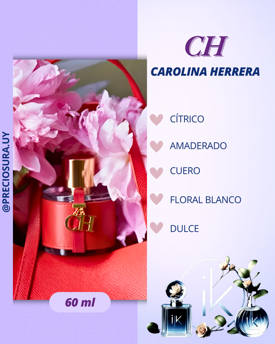 CH de Carolina Herrera es una fragancia de la familia olfativa Oriental Floral para Mujeres. CH se lanzó en 2015. Las Notas de Salida son bergamota, toronja (pomelo) y limón (lima ácida); las Notas de Corazón son flor de azahar del naranjo, rosa y jazmín; las Notas de Fondo son cuero, pachulí, praliné, sándalo, cedro y almizcle.