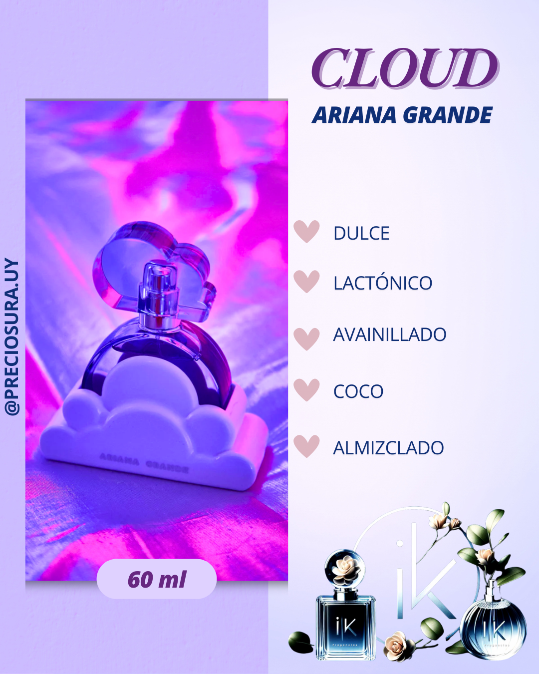 Cloud de Ariana Grande es una fragancia femenina que combina notas frutales, florales y gourmand para crear una experiencia dulce, suave y envolvente. Lanzada en 2018 y creada por Clement Gavarry, esta fragancia es perfecta para mujeres jóvenes y modernas que buscan un aroma que transmita alegría y calidez, ideal para uso diario y ocasiones casuales.
