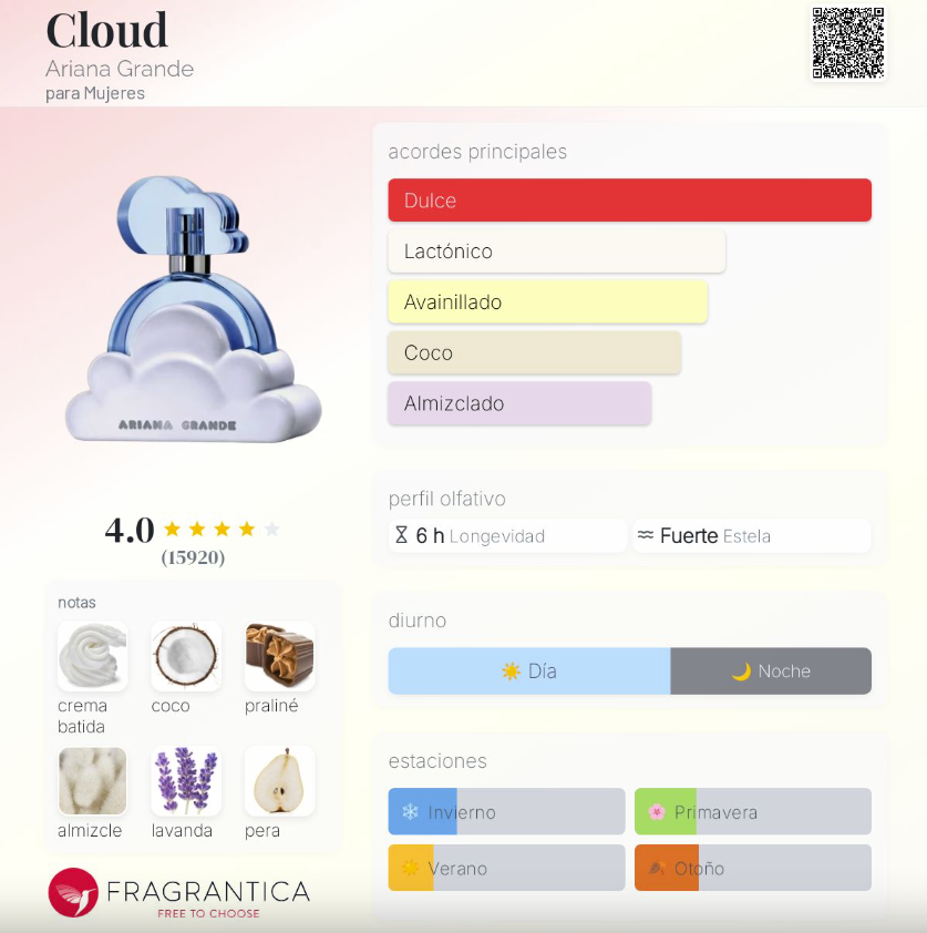 Cloud de Ariana Grande es una fragancia femenina lanzada en 2018, perteneciente a la familia Floral Frutal Gourmand. Creada por el perfumista Clement Gavarry, combina notas frutales, florales y gourmand para crear un aroma dulce, suave y envolvente. Su apertura fresca mezcla lavanda, pera y bergamota, aportando luminosidad y un toque jugoso. En el corazón, una deliciosa combinación de crema batida, coco, praliné y orquídea de vainilla ofrece un carácter gourmand cálido y reconfortante. Finalmente, su fondo de almizcle y notas amaderadas aporta profundidad, suavidad y una estela delicadamente seductora.