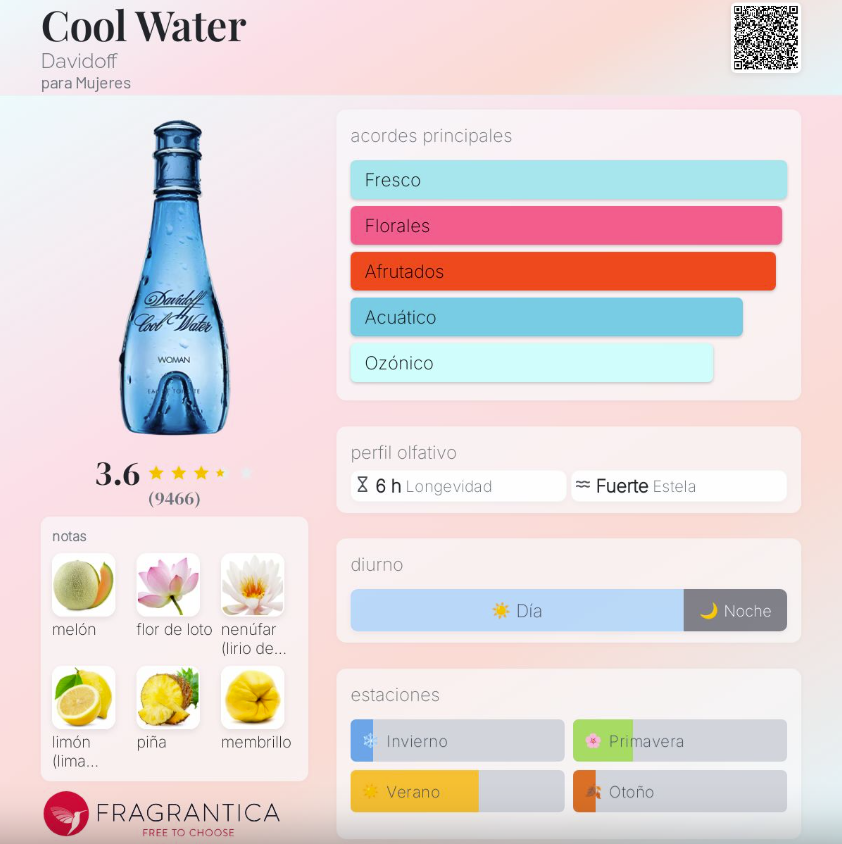 Cool Water de Davidoff es una fragancia femenina lanzada en 1996, perteneciente a la familia Floral Acuática. Creada por el perfumista Pierre Bourdon, es un perfume fresco, limpio y revitalizante que evoca la pureza del agua y la serenidad del océano. Su salida combina melón, flor de loto, limón, piña, membrillo, calone, azucena y grosellas negras, creando un inicio acuático, frutal y muy refrescante. En el corazón, notas de flor de loto, nenúfar, lirio de los valles, jazmín, miel, flor del espino y rosa aportan un carácter floral suave, natural y armonioso. Finalmente, su fondo mezcla almizcle, vetiver, raíz de violeta, frambuesa, durazno, zarzamora, sándalo y vainilla, generando una estela cálida, limpia y sutilmente dulce.