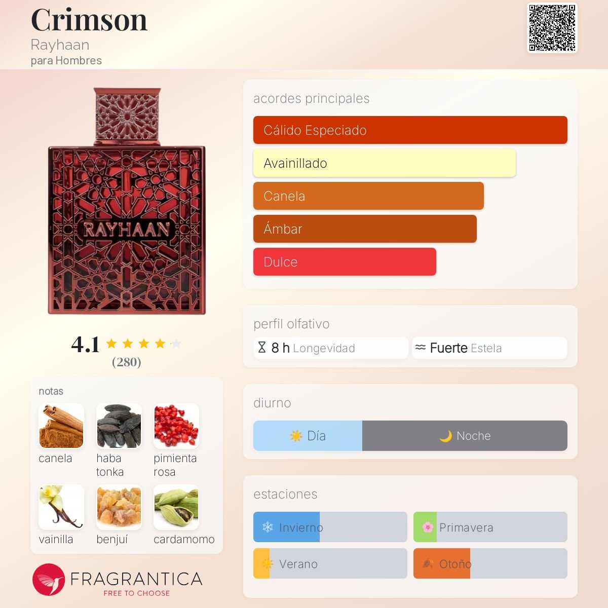 Crimson de Rayhaan es una fragancia masculina perteneciente a la familia Oriental Especiada, ideal para quienes buscan un perfume cálido, intenso y con un toque dulce-sensual. Su salida combina canela, pimienta rosa y cardamomo, creando un inicio especiado y elegante. En el corazón, el pachulí aporta profundidad y carácter. Finalmente, el fondo de haba tonka, vainilla y benjuí deja una estela cremosa, ambarada y muy adictiva, perfecta para destacar.