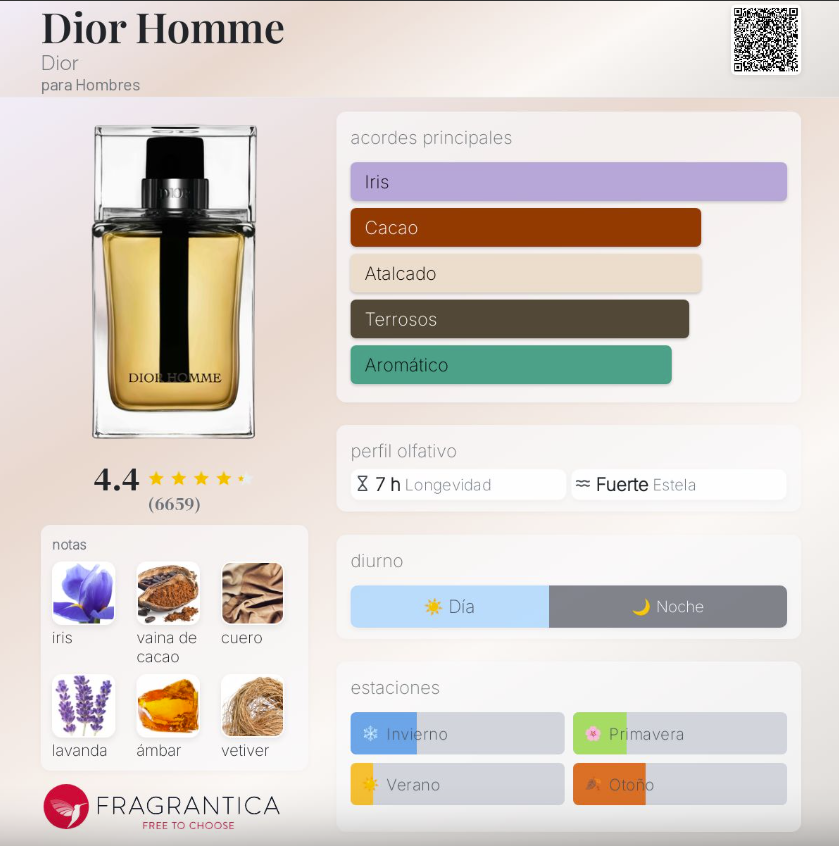 Dior Homme de Dior es una fragancia de la familia Almizcle Amaderado Floral para hombres. Lanzada en 2011 y creada por François Demachy, es un perfume elegante, masculino y sofisticado que se distingue por su combinación única de flores, maderas y cuero. Su corazón de iris —icónico en esta línea— aporta un toque refinado y cremoso, mientras que el cacao y el ámbar añaden calidez. El fondo de cuero y vetiver completa una fragancia moderna, sensual y con mucha personalidad.