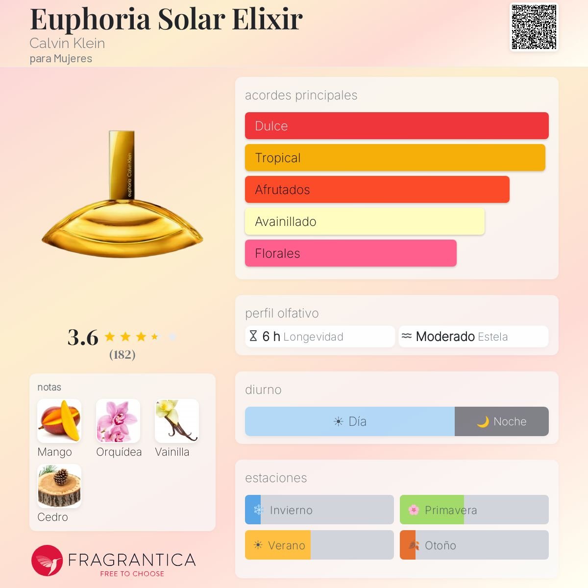Euphoria Solar Elixir de Calvin Klein es una fragancia femenina lanzada en 2026, perteneciente a la familia Oriental Floral. Creada por Nicolas Bonneville, es una versión luminosa, tropical y adictiva dentro de la línea Euphoria. Su apertura con mango aporta un inicio jugoso, dulce y vibrante. En el corazón, la orquídea suma un toque floral exótico y elegante. Finalmente, el fondo de vainilla y cedro deja una estela cálida, cremosa y ligeramente amaderada, perfecta para destacar con un aire sensual pero fresco.