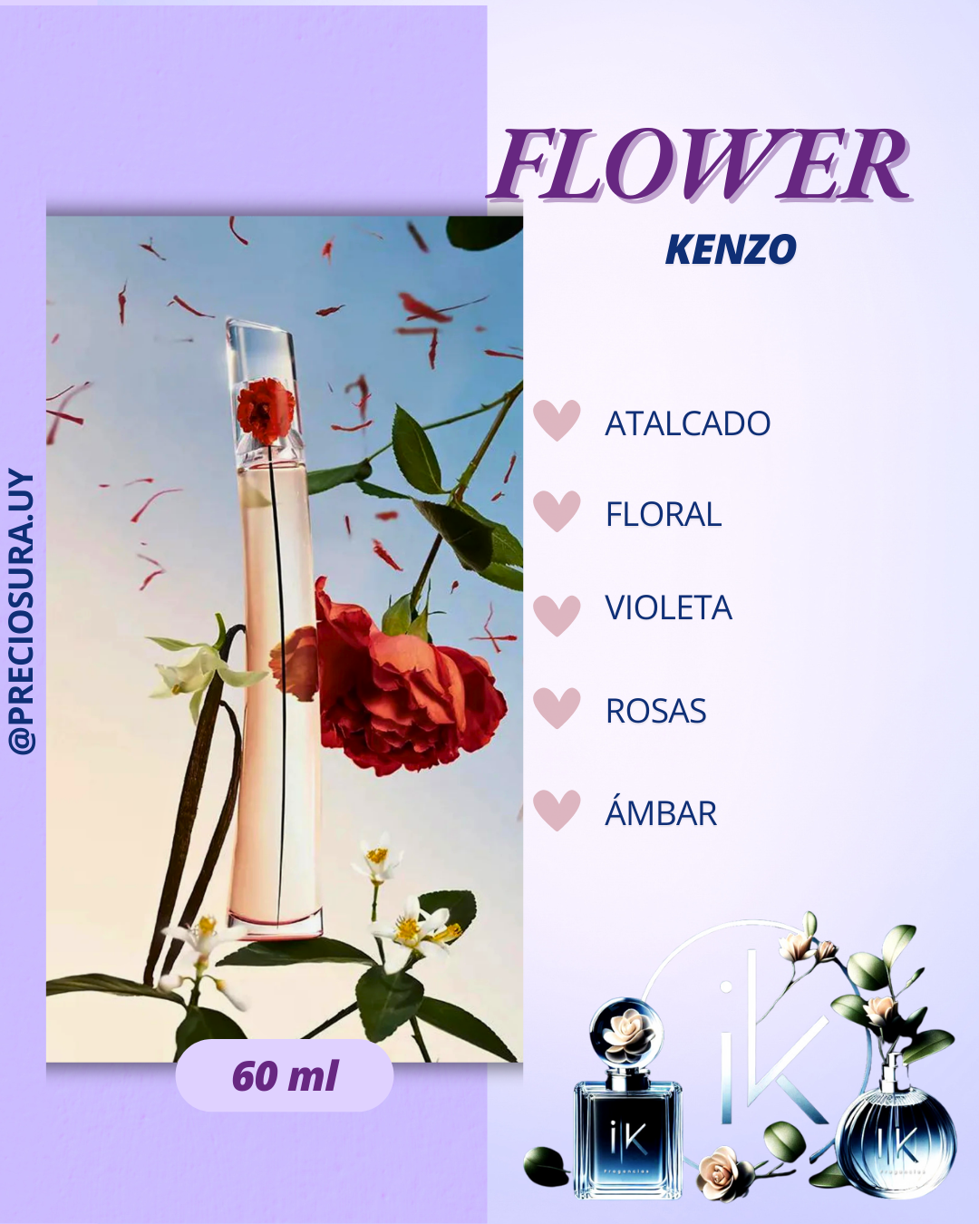 Flower by Kenzo de Kenzo es una fragancia de la familia olfativa Oriental Floral para Mujeres. Flower by Kenzo se lanzó en 2000. Flower by Kenzo fue creada por Alberto Morillas y Christian Dussoulier. Las Notas de Salida son rosa de Bulgaria (rosa Damascena de Bulgaria), flor del espino, grosellas negras y mandarina; las Notas de Corazón son violeta de Parma, rosa, opopónaco y jazmín; las Notas de Fondo son vainilla, almizcle blanco y incienso.