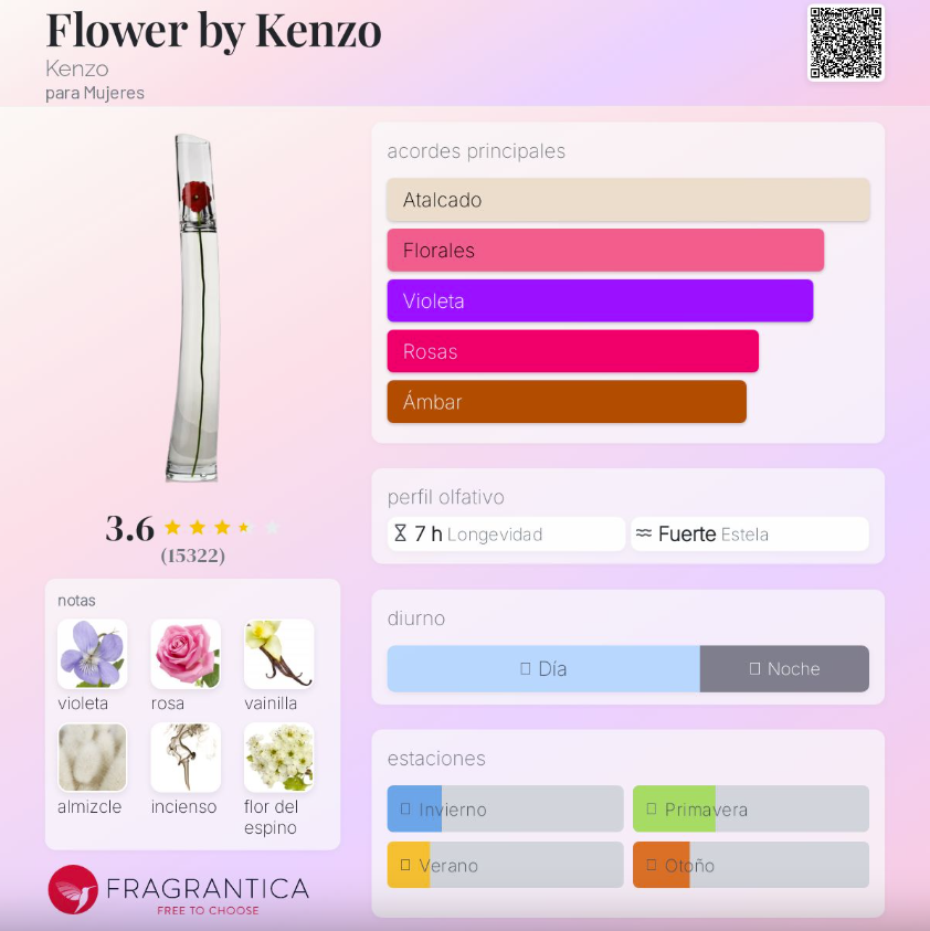 Flower by Kenzo de Kenzo es una fragancia femenina lanzada en 2000, perteneciente a la familia Oriental Floral. Creada por los perfumistas Alberto Morillas y Christian Dussoulier, es un perfume icónico, delicado y poético, inspirado en la amapola urbana: una flor sin aroma reimaginada a través de un acorde floral suave y envolvente. Su salida combina rosa de Bulgaria, flor del espino, grosellas negras y mandarina, logrando un inicio fresco y femenino. En el corazón, la violeta de Parma, la rosa, el opopónaco y el jazmín aportan un carácter floral empolvado, elegante y muy distintivo. Finalmente, su fondo de vainilla, almizcle blanco e incienso crea una estela cálida, etérea y profundamente reconfortante.