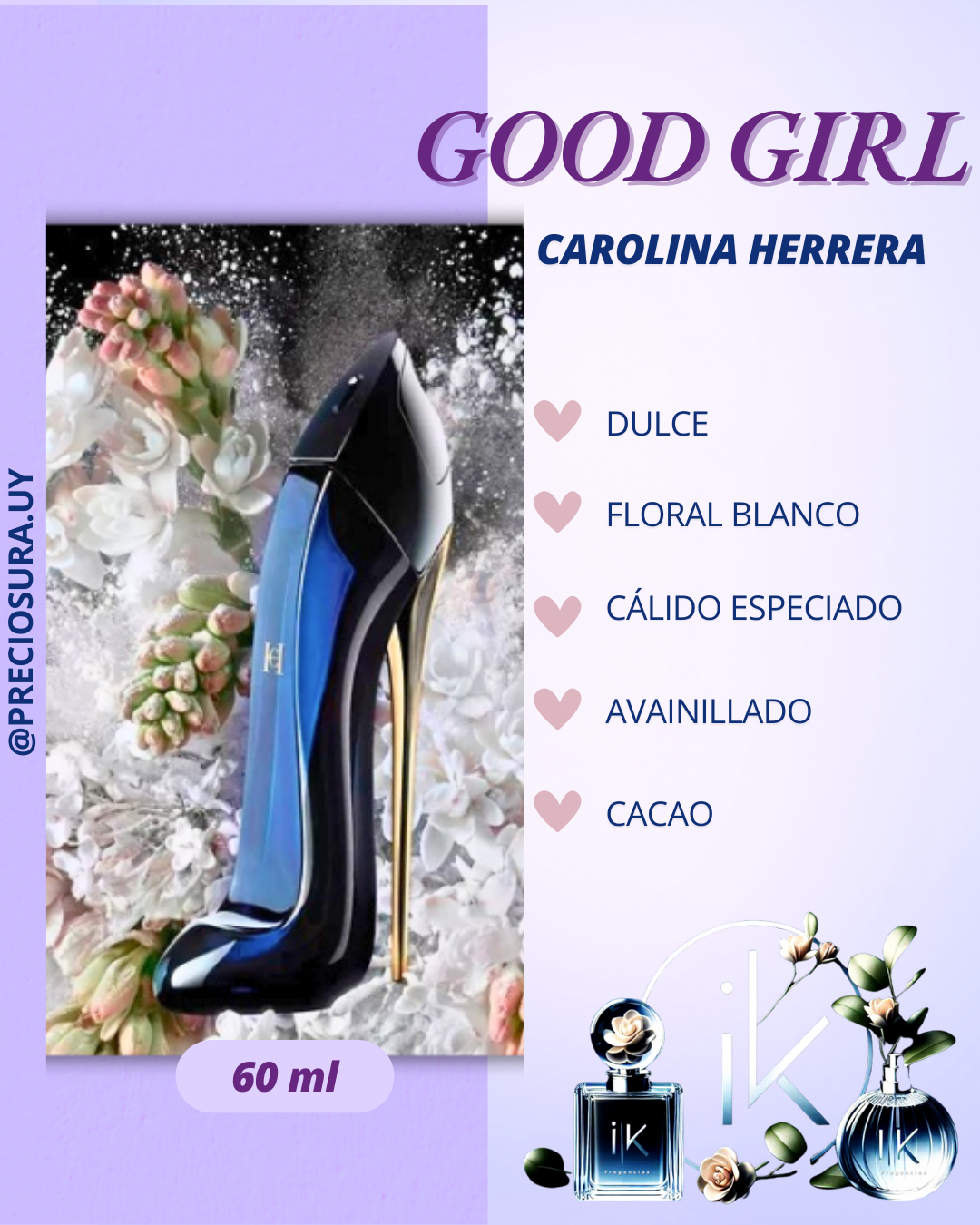 Good Girl de Carolina Herrera es una fragancia femenina que encarna la complejidad y dualidad de la mujer moderna, combinando notas orientales y florales en una mezcla audaz y sofisticada. Lanzada en 2016 y creada por Louise Turner y Quentin Bisch, esta fragancia es ideal para mujeres seguras que quieren destacar con un aroma intenso y cautivador.