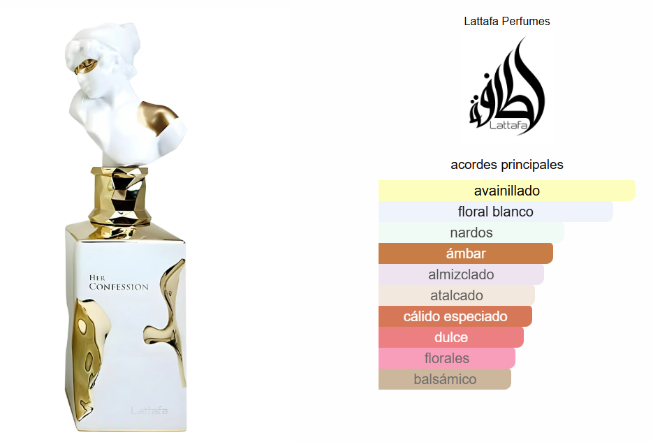Her Confession de Lattafa Perfumes es una fragancia femenina que se inspira en el exclusivo Blanche Bête de Les Liquides Imaginaires. Lanzada recientemente, combina una apertura especiada y mística con un corazón floral profundo enriquecido con toques de incienso, para luego asentarse en un fondo dulce, sensual y envolvente. Su carácter elegante y seductor la convierte en una opción ideal para la mujer moderna que desea proyectar misterio, sofisticación y una estela memorable.