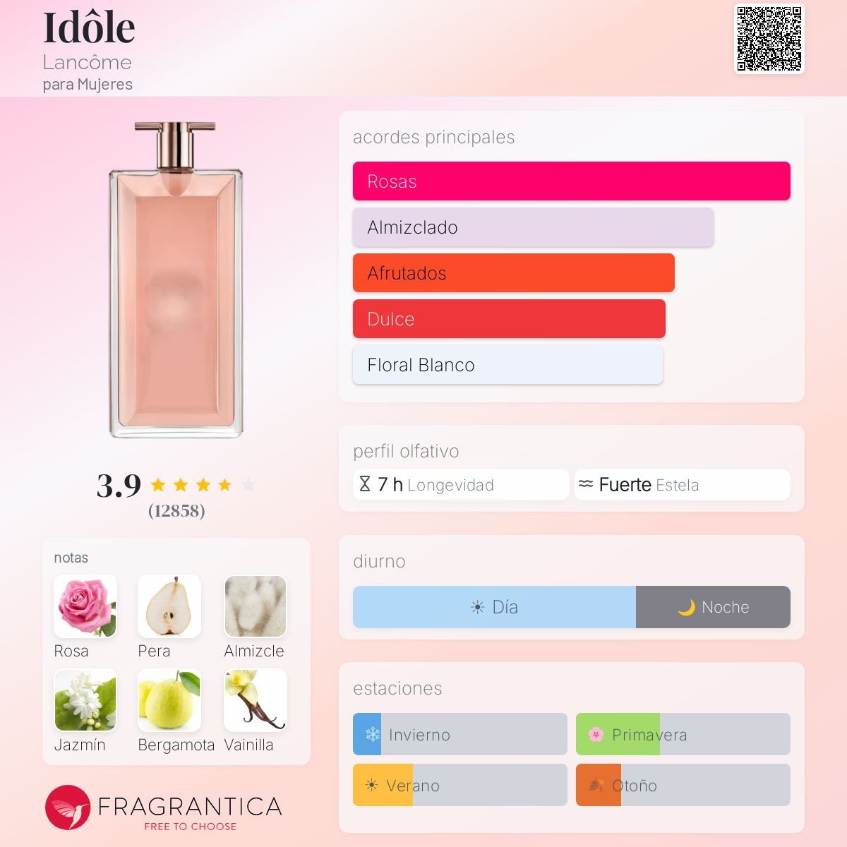 Idôle de Lancôme es una fragancia femenina lanzada en 2019, perteneciente a la familia Chipre Floral. Creada por Shyamala Maisondieu, Adriana Medina-Baez, Nadège Le Garlantezec y Sonia Constant, es un perfume moderno, limpio y elegante, pensado para mujeres seguras y sofisticadas. Su apertura combina pera, bergamota y pimienta rosa, logrando un inicio fresco, ligeramente dulce y chispeante. En el corazón, la rosa y el jazmín aportan feminidad y delicadeza. Finalmente, el fondo de almizcle blanco, vainilla, pachulí y cedro deja una estela suave, limpia y refinada.