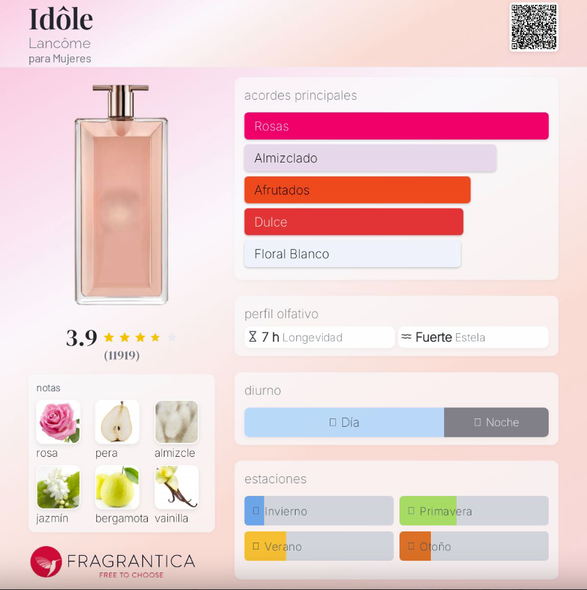 Idôle de Lancôme es una fragancia femenina lanzada en 2019, perteneciente a la familia Chipre Floral. Creada por las perfumistas Shyamala Maisondieu, Adriana Medina-Baez y Nadège Le Garlantezec, representa la visión de una mujer empoderada, moderna y luminosa. Su apertura fresca y chispeante mezcla pera, bergamota y pimienta rosa, aportando brillo y energía. En el corazón, la combinación de rosa y jazmín crea un aroma floral puro, elegante y ultrafemenino. Finalmente, su fondo suave y envolvente de almizcle blanco, vainilla, pachulí y cedro aporta calidez, sofisticación y una estela delicada pero memorable.