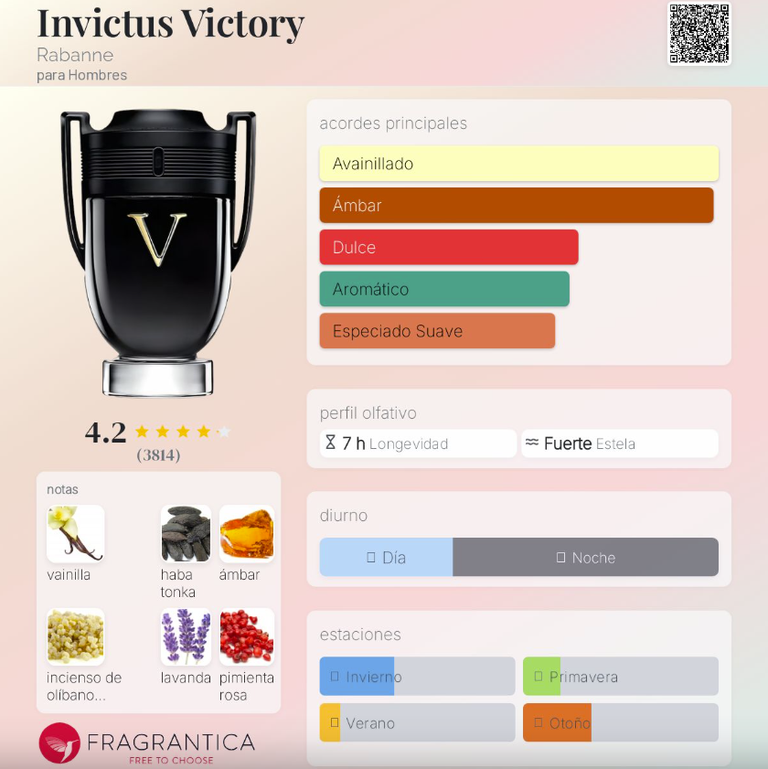 Invictus Victory de Rabanne es una fragancia masculina lanzada en 2021, perteneciente a la familia Oriental. Es un perfume intenso, poderoso y adictivo, creado para hombres que buscan una estela cálida, sensual y llena de carácter. Su salida combina pimienta rosa y limón, creando un inicio vibrante, fresco y especiado. En el corazón, el incienso de olíbano y la lavanda aportan un contraste aromático, profundo y ligeramente ahumado. Finalmente, su fondo une vainilla, haba tonka y ámbar, generando un cierre dulce, cálido y muy seductor, característico de la línea Victory.