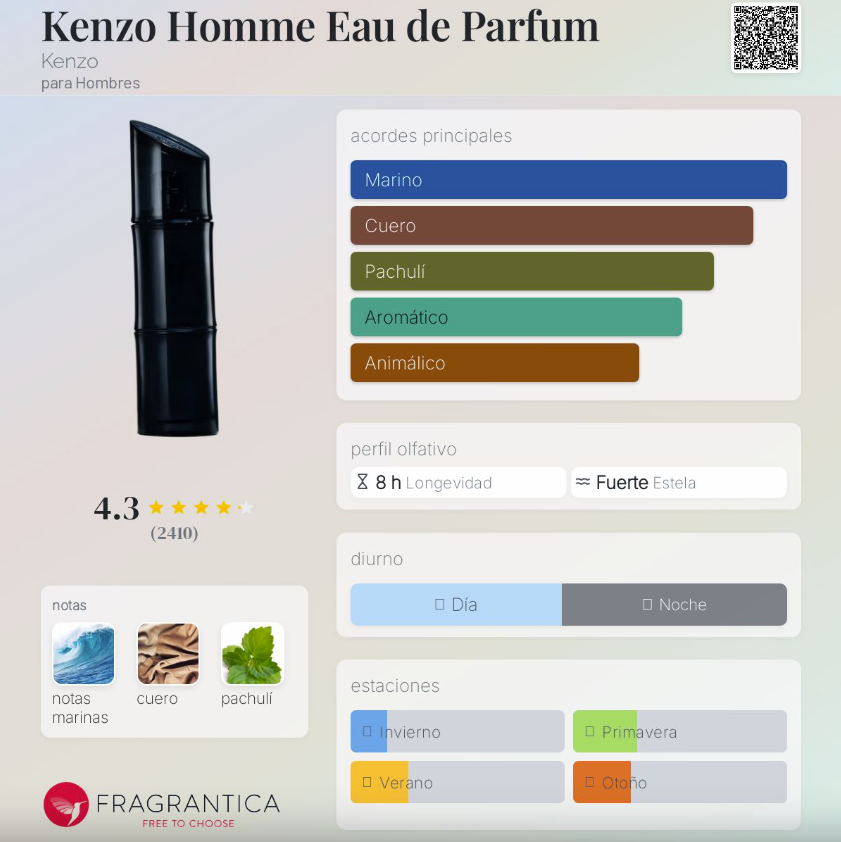 Kenzo Homme de Kenzo es una fragancia masculina que reinterpreta la esencia marina con un enfoque moderno y minimalista. Creada por el perfumista Quentin Bisch, transmite frescura, libertad y una naturalidad inspirada en el océano. Su carácter limpio, elegante y contemporáneo lo convierte en un perfume versátil y perfecto para el día a día, especialmente para hombres que buscan proyectar una sencillez sofisticada sin esfuerzo. Su composición es cálida, marina y refinada, ideal para climas cálidos y ambientes informales.