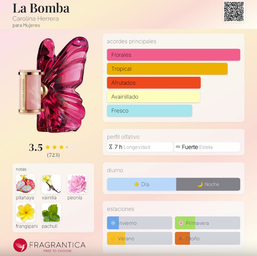 La Bomba de Carolina Herrera es una fragancia de la familia Oriental Floral para mujeres. Lanzada en 2025 y creada por Christophe Raynaud, Quentin Bisch y Louise Turner, es una esencia explosiva, moderna y femenina que combina una salida frutal exótica, un corazón floral vibrante y un fondo cálido y sensual. Su composición crea un aroma audaz, magnético y adictivo, ideal para quienes buscan destacar con una fragancia contemporánea y atrevida.