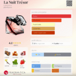 La Nuit Trésor de Lancôme es una fragancia femenina lanzada en 2015, perteneciente a la familia Oriental Vainilla. Creada por los perfumistas Christophe Raynaud y Amandine Clerc-Marie, es un perfume profundo, dulce y extremadamente seductor, pensado para mujeres que buscan un aroma intenso, envolvente y lleno de misterio. Su salida combina pera, naranja tangerina y bergamota, creando un inicio frutal brillante y tentador. En el corazón, notas de fresa, orquídea de vainilla, rosa negra y maracuyá aportan un toque floral-gourmand exótico y sensual. Finalmente, su fondo es una sinfonía cálida y adictiva que mezcla praliné, caramelo, lichi, vainilla, pachulí, incienso, café, regaliz, cumarina y papiro de Egipto, logrando una estela intensa, cremosa y memorable.