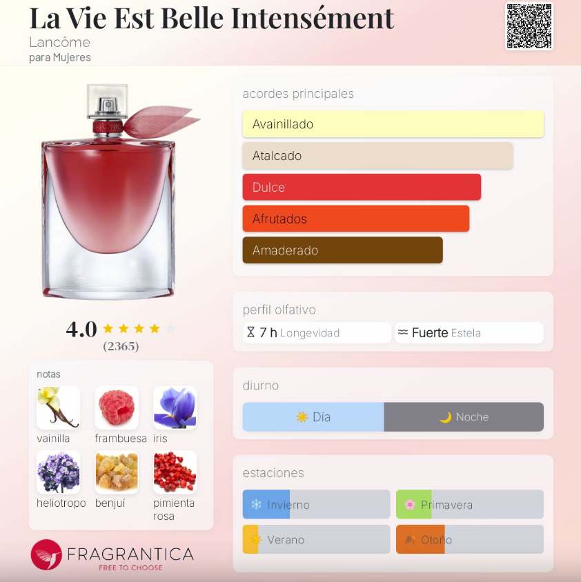 La Vie Est Belle Intensément de Lancôme es una fragancia femenina lanzada en 2020, perteneciente a la familia Oriental Floral. Creada por los perfumistas Anne Flipo y Nicolas Beaulieu, es una interpretación más intensa, vibrante y emocional del clásico La Vie Est Belle. Su salida combina frambuesa, pimienta rosa y bergamota, creando un inicio frutal brillante y ligeramente especiado. En el corazón, el heliotropo, la flor de azahar del naranjo y el jazmín sambac aportan un carácter floral cálido, dulce y envolvente. Finalmente, su fondo profundo mezcla vainilla, iris, benjuí, pachulí y sándalo, logrando una estela cremosa, sensual y duradera.