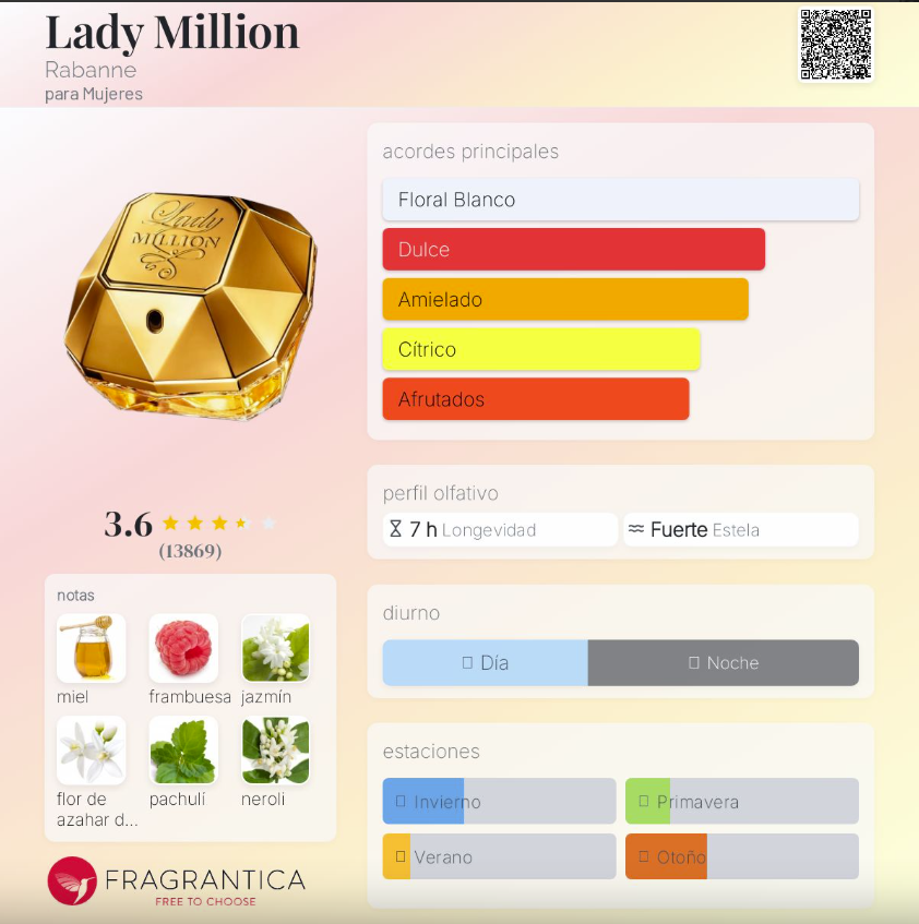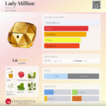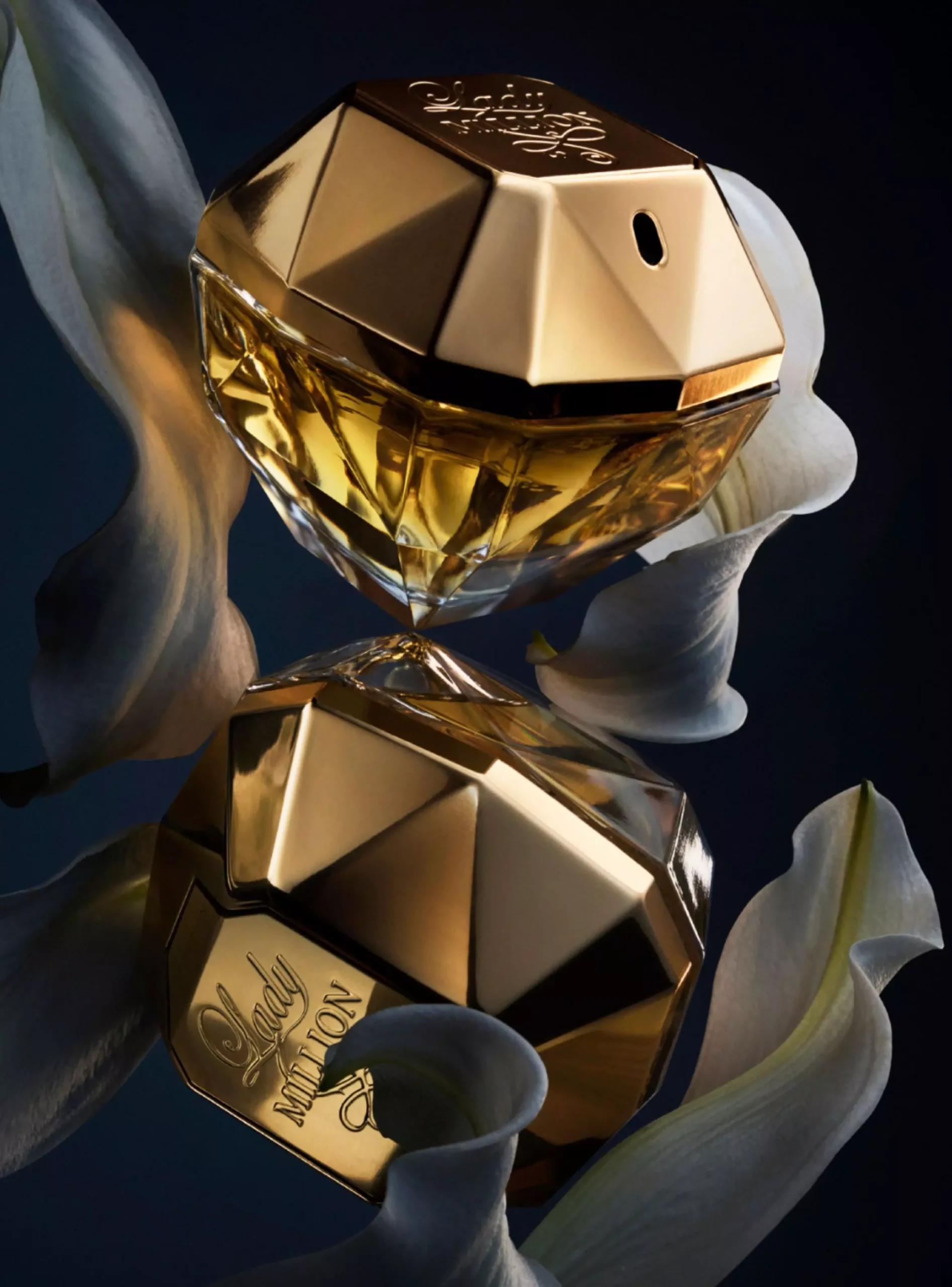 Lady Million de Rabanne es una fragancia femenina lanzada en 2010, perteneciente a la familia Floral Frutal. Creada por los perfumistas Anne Flipo, Beatrice Piquet, Dominique Ropion y Bruno Jovanovic, es un perfume luminoso, sofisticado y lleno de personalidad. Su salida combina frambuesa, neroli y limón de Amalfi, creando un inicio chispeante, fresco y ligeramente dulce. En el corazón, el jazmín, la flor del naranjo africano y la gardenia aportan elegancia, feminidad y un toque seductor. Finalmente, su fondo cálido y adictivo mezcla miel blanca, pachulí y ámbar, generando una estela envolvente, dorada y muy distintiva.
