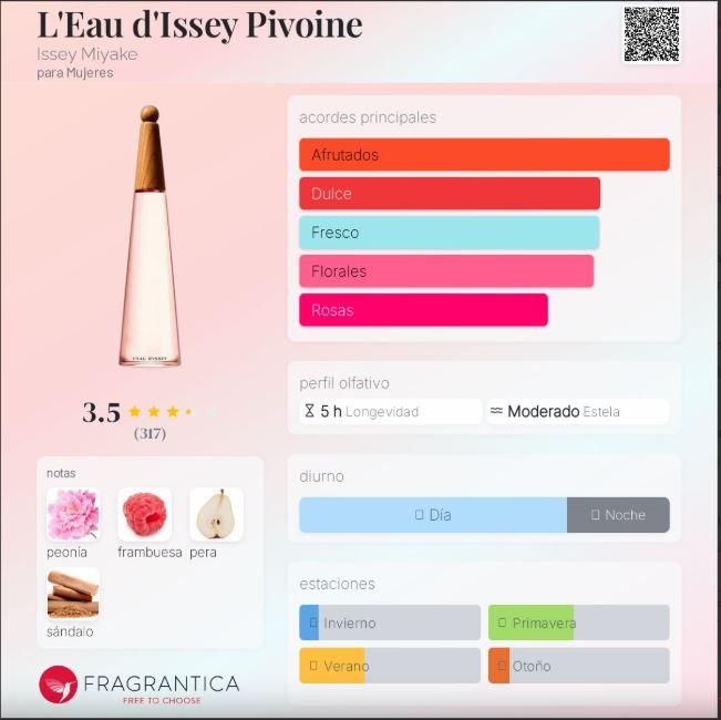 L’Eau d’Issey Pivoine de Issey Miyake, lanzada en 2023, pertenece a la familia Floral Frutal. Es una fragancia luminosa y delicada que captura la suavidad de la peonía en fusión con la jugosidad de la pera y la frambuesa. Su estela, fresca y femenina, se equilibra con la calidez cremosa del sándalo, logrando un perfume moderno y natural.
