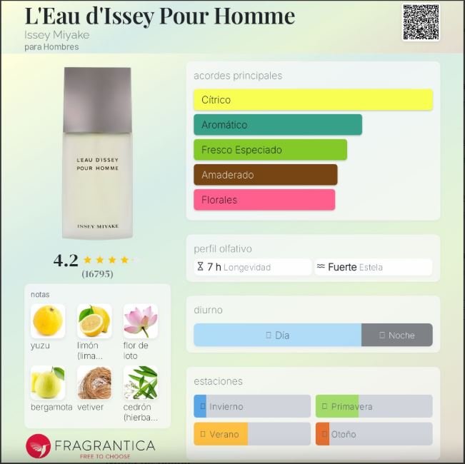 L’Eau d’Issey Pour Homme de Issey Miyake es una fragancia masculina de la familia Amaderada Acuática, lanzada en 1994 y creada por Jacques Cavallier Belletrud. Con su estilo limpio, natural y sofisticado, se convirtió rápidamente en un clásico atemporal que captura la esencia del agua y la frescura de la naturaleza.