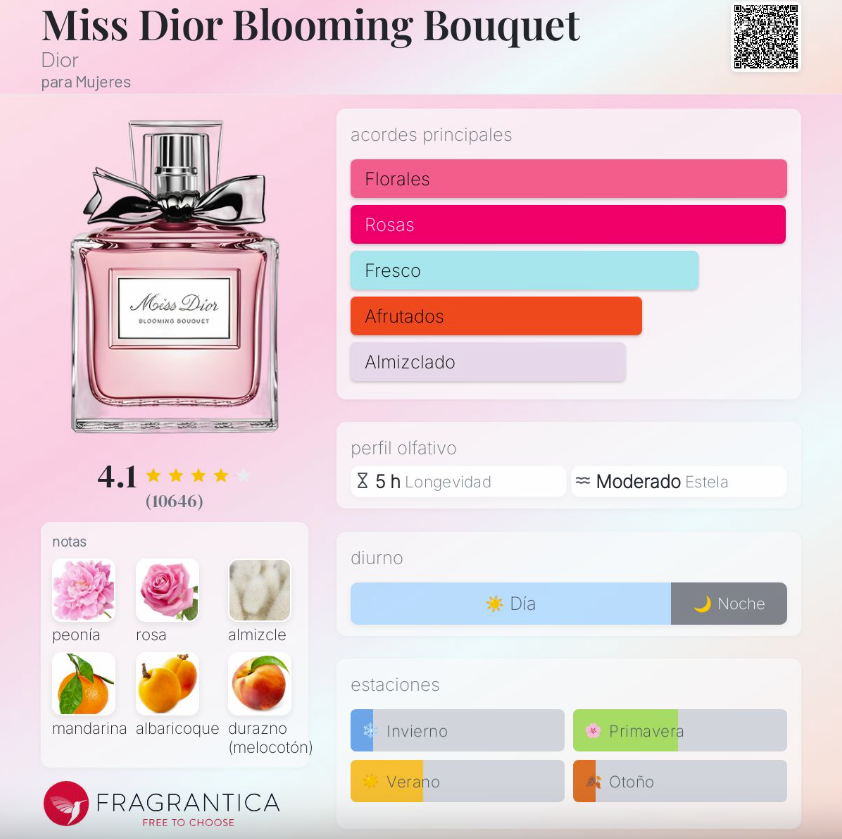 Miss Dior Blooming Bouquet de Dior es una fragancia femenina lanzada en 2014, perteneciente a la familia Floral. Creada por la perfumista Louise Turner, es un perfume delicado, romántico y luminoso, inspirado en un ramo de flores frescas. Su salida de mandarina siciliana aporta un toque chispeante y suave. En el corazón, la combinación de peonía rosa, rosa de Damasco, chabacano y durazno crea un aroma floral afrutado, tierno y radiante. Finalmente, el almizcle blanco en el fondo deja una estela limpia, aterciopelada y elegante.