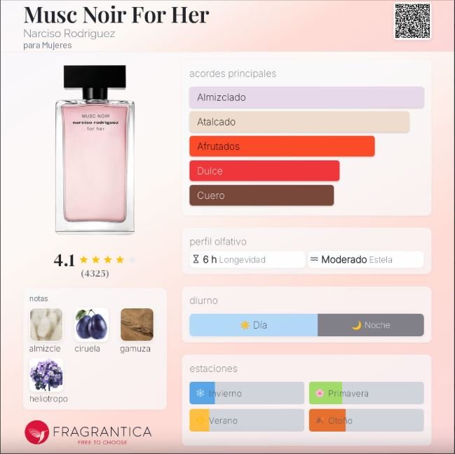 Musc Noir For Her de Narciso Rodriguez es una fragancia femenina lanzada en 2021, creada por Sonia Constant. Pertenece a la icónica línea For Her y se distingue por su sensualidad oscura y misteriosa. Con un inicio afrutado, un corazón de almizcle cremoso y un fondo aterciopelado de gamuza, esta composición refleja fuerza, feminidad y sofisticación. Es un perfume íntimo y adictivo, ideal para quienes buscan un aroma elegante con un toque enigmático.