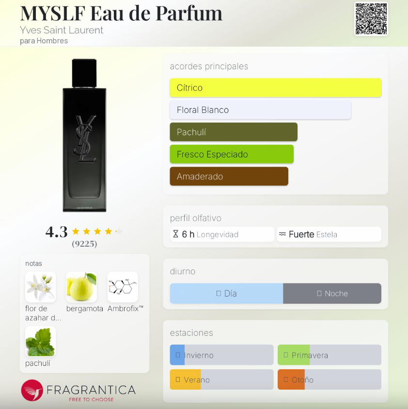 MYSLF Eau de Parfum de Yves Saint Laurent es una fragancia de la familia Aromática para hombres. Lanzada en 2023 y creada por Christophe Raynaud, Antoine Maisondieu y Daniela Andrier, es un perfume moderno, limpio y minimalista que celebra la masculinidad contemporánea. Su salida cítrica y luminosa de bergamota se funde con un corazón floral elegante y masculino de flor de azahar, mientras que el fondo amaderado y ambarado con Ambrofix™ aporta calidez, profundidad y una estela sofisticada.
