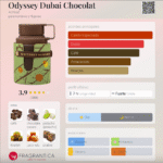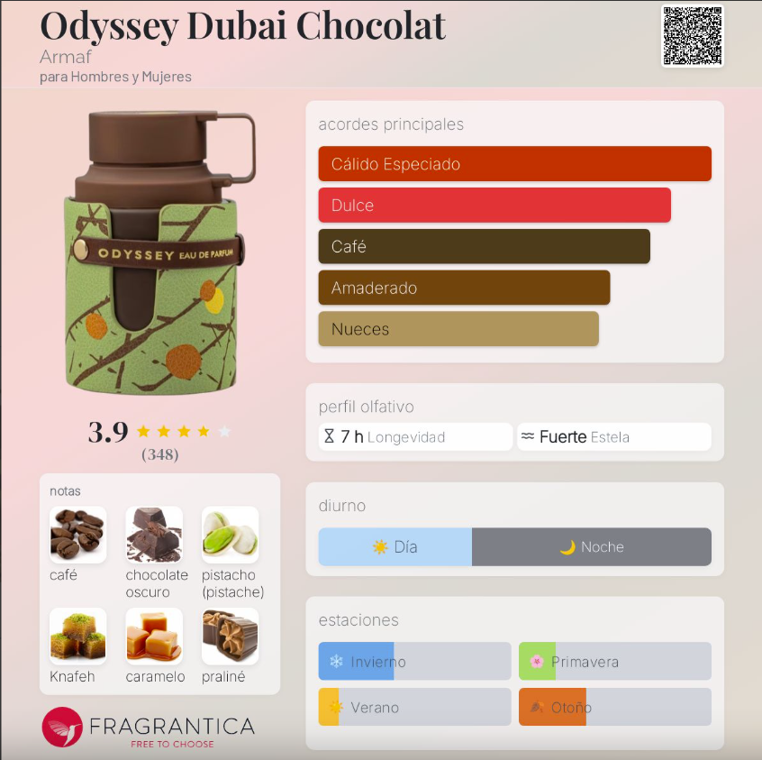Odyssey Dubai Chocolat de Armaf es una fragancia unisex lanzada en 2025, perteneciente a la familia Oriental Vainilla. Inspirada en Tribeca de Bond No. 9, esta exquisita creación combina dulzura, calidez y sofisticación gourmand con un toque oriental moderno. Su apertura deliciosa fusiona café, pistacho, knafeh (postre árabe), praliné y avellana, creando una experiencia olfativa irresistible y cremosa. En el corazón, el chocolate, la vainilla y el cardamomo aportan profundidad, elegancia y un dulzor especiado equilibrado. Finalmente, el fondo de caramelo, Amberwood y haba tonka deja una estela sensual, aterciopelada y adictiva. Ideal para quienes buscan un aroma gourmand lujoso y envolvente.
