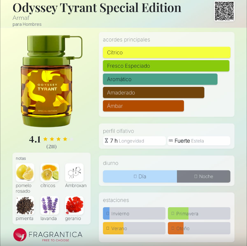 Odyssey Tyrant Special Edition de Armaf es una fragancia masculina lanzada en 2023, perteneciente a la familia Oriental Amaderada. Este perfume combina magistralmente el ADN de dos íconos del lujo: Bvlgari Tygar (por su frescura cítrica y brillante) y Dior Sauvage EDT (por su carácter aromático y magnético). Su salida vibrante de toronja y cítricos abre con energía y vitalidad. En el corazón, la pimienta, la lavanda, el geranio y el elemí aportan un toque especiado y masculino, equilibrado por una elegancia moderna. Finalmente, el fondo de ambroxan, vetiver, cedro y maderas refinadas deja una estela limpia, sensual y duradera. Ideal para quienes buscan potencia, elegancia y frescura en una misma fragancia.