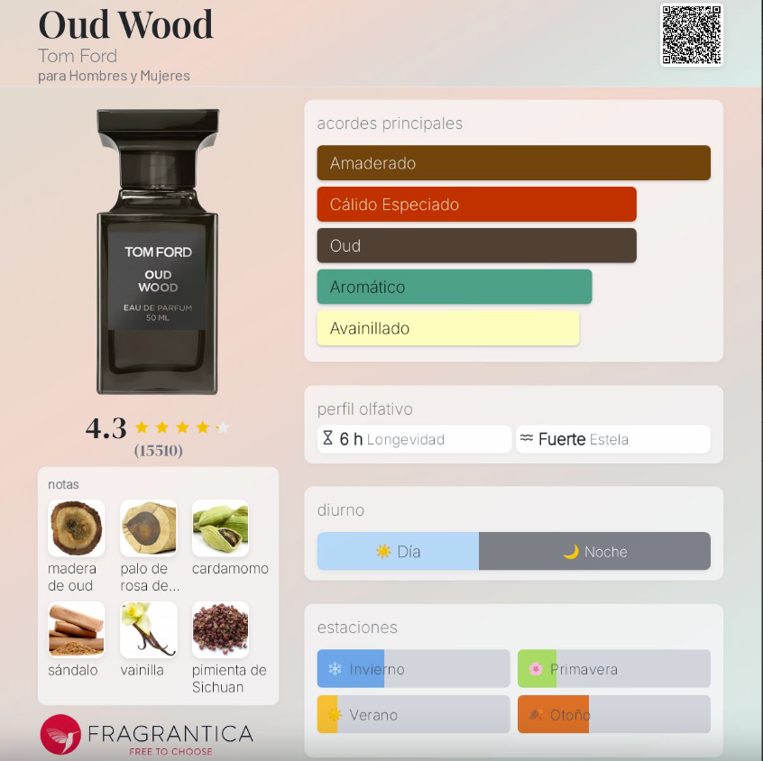 Oud Wood de Tom Ford es una fragancia unisex lanzada en 2007, perteneciente a la familia Oriental Amaderada. Creada por el perfumista Richard Herpin, es una de las propuestas más icónicas y elegantes de la colección Private Blend. Su aroma combina la profundidad del oud con maderas exóticas, especias cálidas y un fondo cremoso y envolvente. Es sofisticada, íntima y adictiva: una fragancia pensada para quienes buscan lujo discreto y una huella inolvidable.