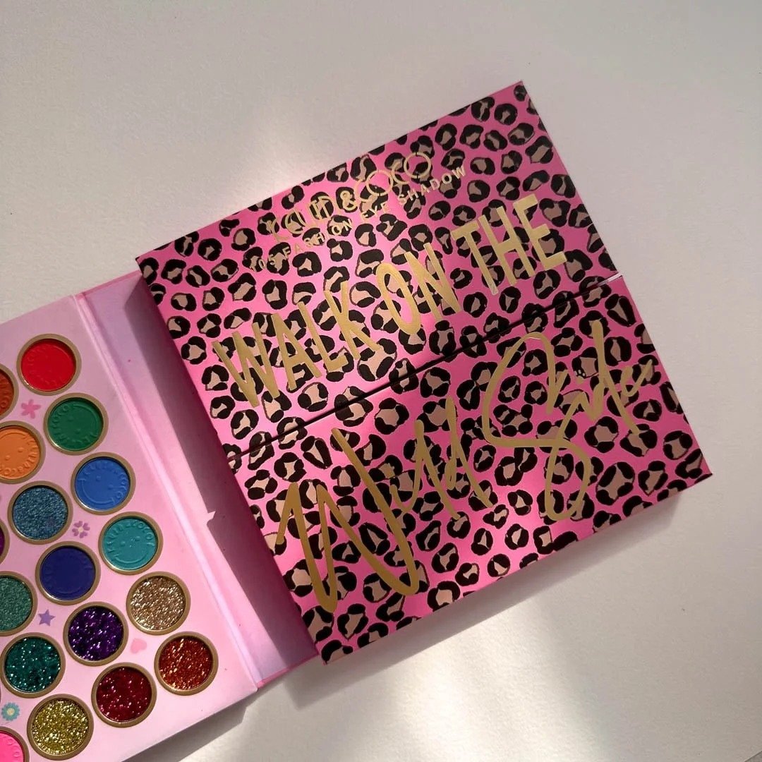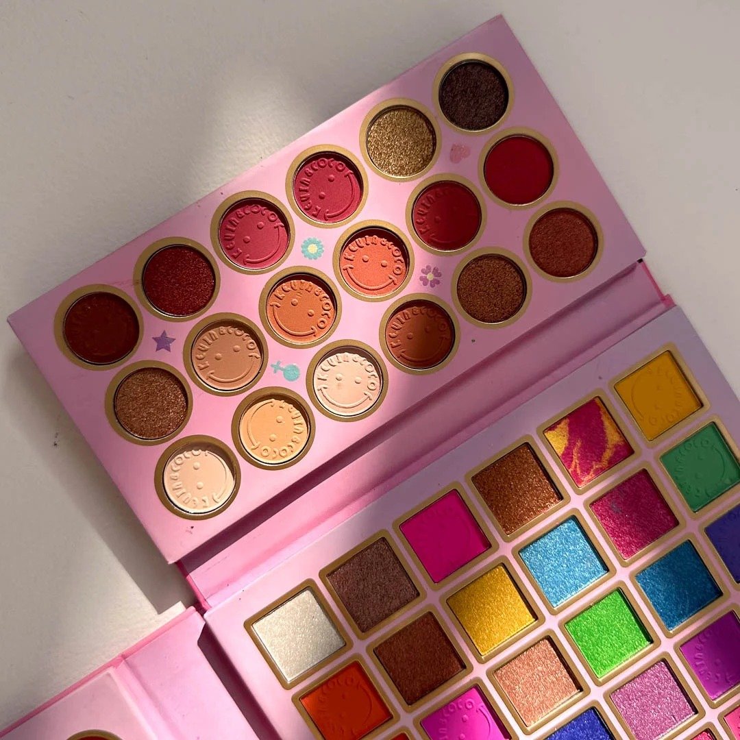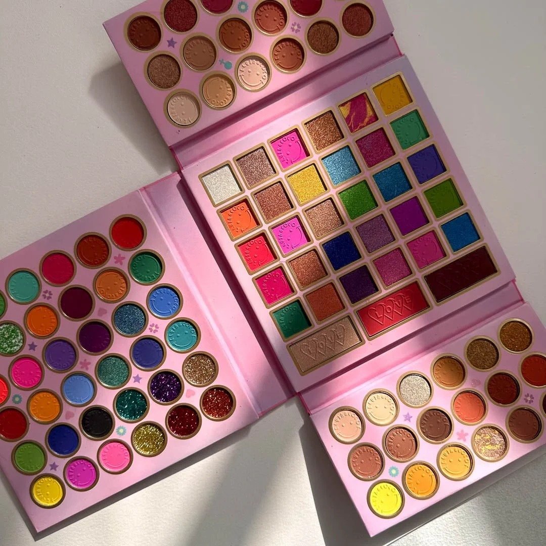 Paleta desplegable con 105 sombras de alta pigmentación y fácil difuminado, distruibuidas en mates, satinadas, pigmentos, glitter prensados, 1 iluminador y 1 rubor.