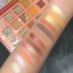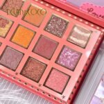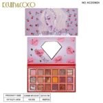 Paleta de maquillaje con 18 sombras distribuidas en mate, satinadas y pigmento prensado.