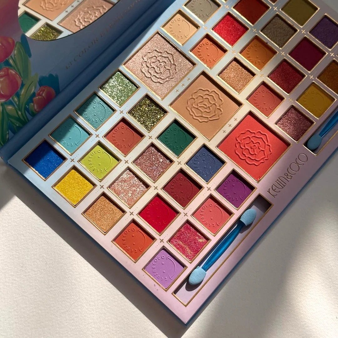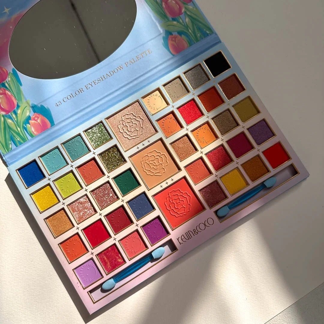Tiene 43 sombras de alta pigmentación y fácil difuminado distribuidas en mates, satinadas, pigmentos prensados, glitter prensados, 2 iluminadores y 1 rubor.