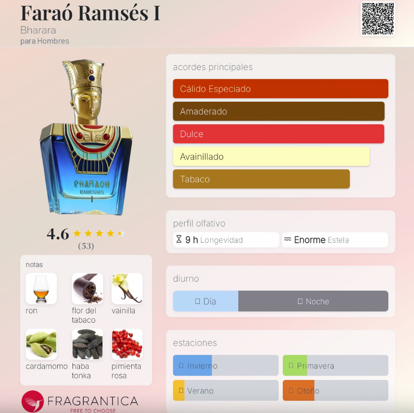 Pharaoh Ramsés I de Bharara es una fragancia masculina lanzada en 2025, perteneciente a la familia Amaderada Especiada. Esta creación combina fuerza, elegancia y calidez oriental en una composición intensa y magnética. Su apertura poderosa de ron, cardamomo y pimientas (rosa y negra) se mezcla con un toque cítrico de bergamota, ofreciendo un inicio especiado y vibrante. En el corazón, el tabaco, la haba tonka, el ámbar, el cipriol y el pachulí aportan profundidad, sensualidad y carácter. Finalmente, el fondo de vainilla, sándalo, caramelo, musgo y cedro deja una estela cálida, dulce y amaderada que transmite poder y sofisticación.