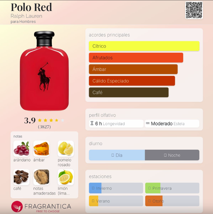 Polo Red de Ralph Lauren es una fragancia masculina lanzada en 2013, perteneciente a la familia Amaderada Especiada. Creada por el perfumista Olivier Gillotin, es un perfume vibrante, energético y seductor que combina frutas rojas, especias cálidas y un fondo amaderado intenso. Su salida mezcla arándano, toronja (pomelo) y limón italiano, creando un inicio chispeante, fresco y ligeramente dulce. En el corazón, el azafrán y la salvia aportan un toque especiado elegante y masculino. Finalmente, su fondo de ámbar, café y notas amaderadas deja una estela cálida, profunda y magnética.