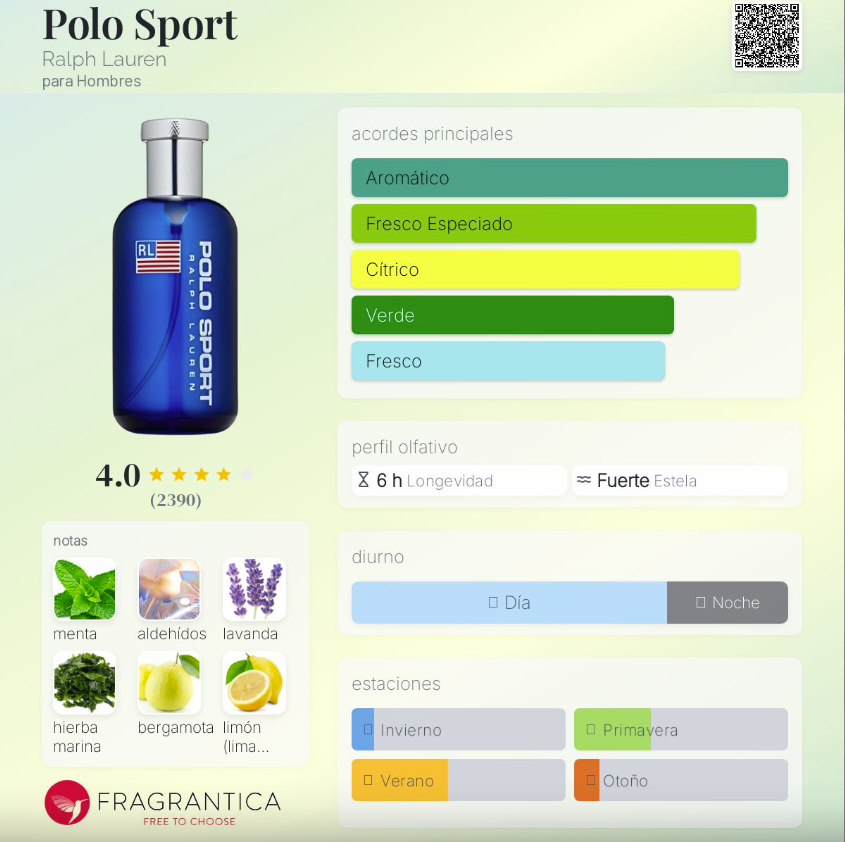 Polo Sport de Ralph Lauren es una fragancia masculina lanzada en 1994, perteneciente a la familia Aromática Verde. Creada por el perfumista Harry Fremont, es un perfume fresco, limpio y deportivo, pensado para hombres activos que buscan una fragancia energizante y versátil. Su salida combina menta, aldehídos, lavanda, bergamota, mandarina, limón, abrótano y neroli, creando un inicio vibrante, cítrico y dinámico. En el corazón, la hierba marina, el jengibre, el jazmín, el geranio, el ciclamen, el palo de rosa de Brasil y la rosa aportan un toque aromático, floral y acuático equilibrado. Finalmente, su fondo une almizcle, sándalo, cedro, madera de gaiac y ámbar, logrando una estela fresca, masculina y duradera.