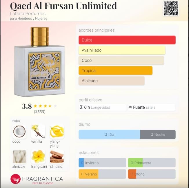 Qaed Al Fursan Unlimited de Lattafa Perfumes es una fragancia floral frutal gourmand unisex, lanzada en 2022. Se ha popularizado como un dupe de Le Beau Le Parfum de Jean Paul Gaultier y de Coco Vanille de Mancera, gracias a su carácter tropical, dulce y sensual que combina frescura frutal, flores exóticas y un fondo cremoso avainillado.