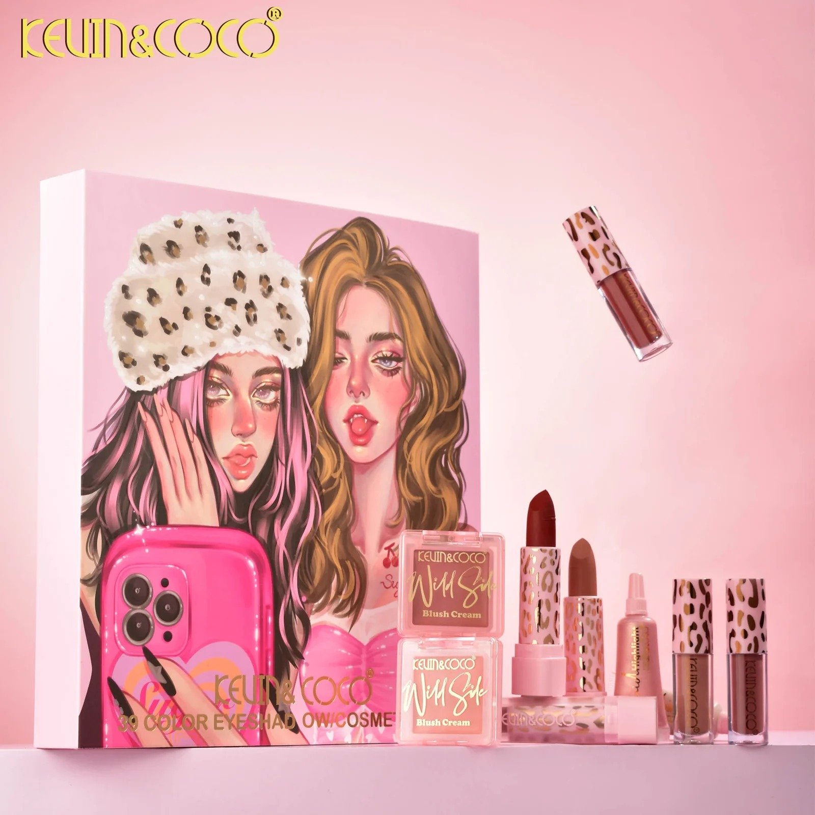 Set de Belleza que incluye sombras, rubores en crema, iluminador, rubor y contorno en polvo, labiales en crema, líquidos mate y gloss.