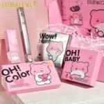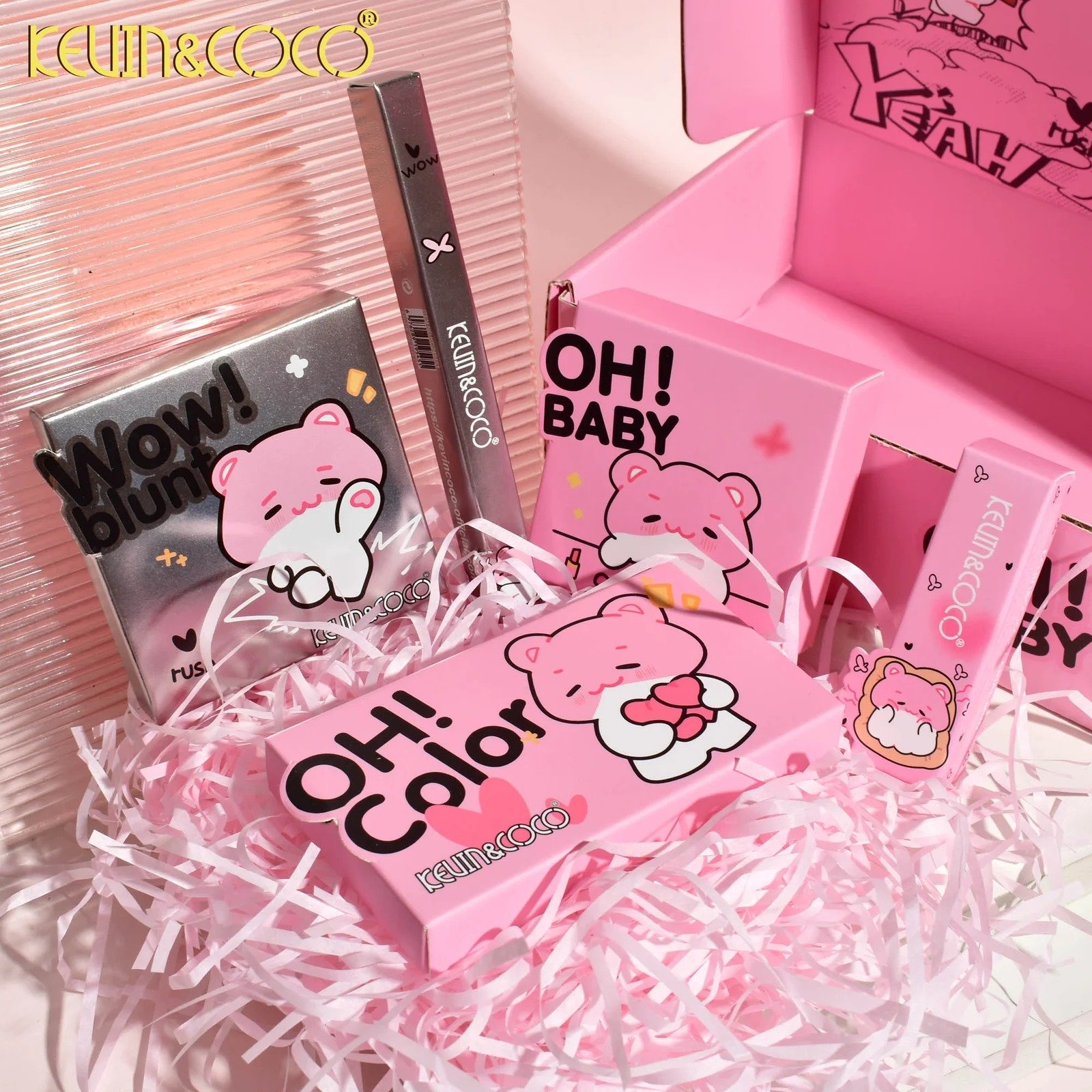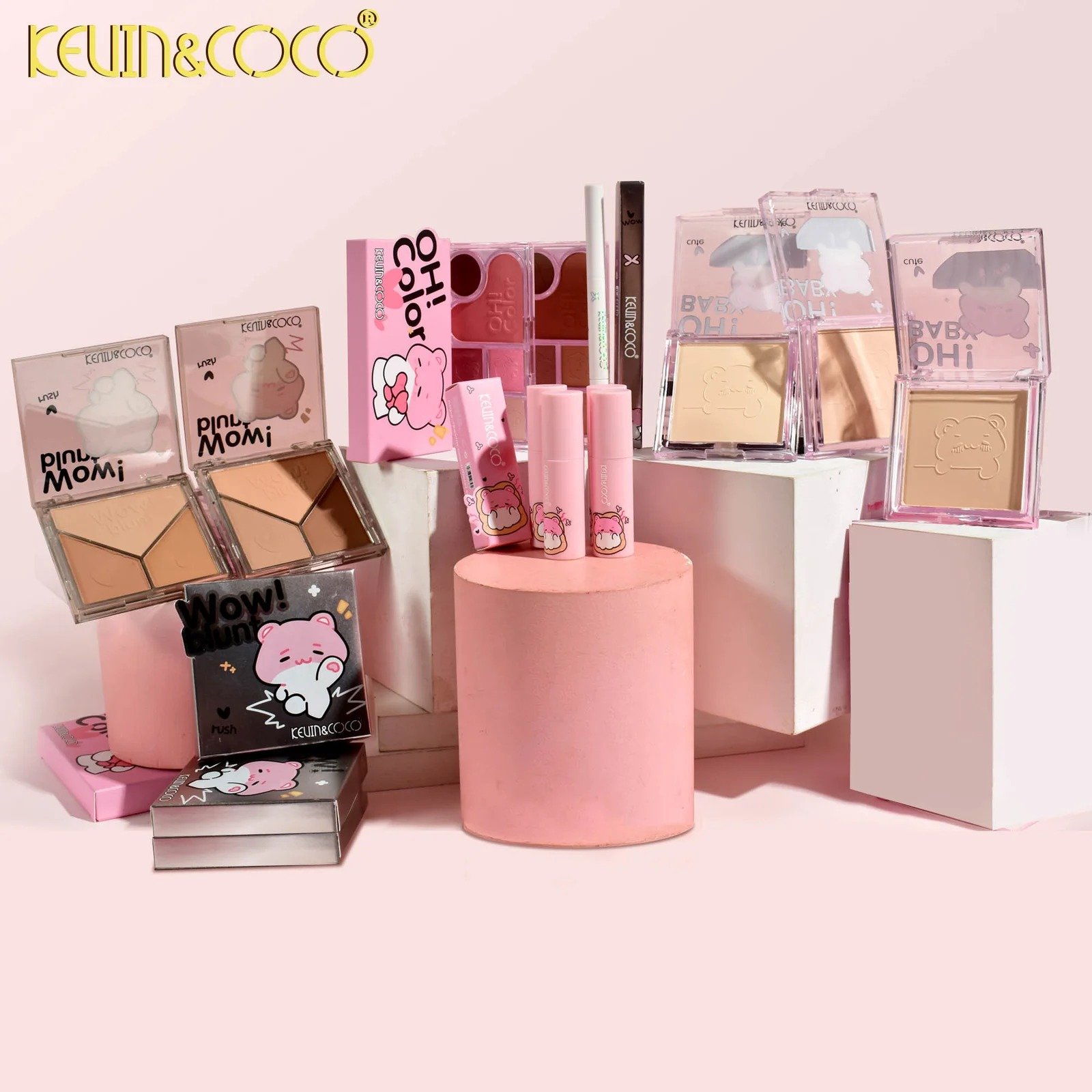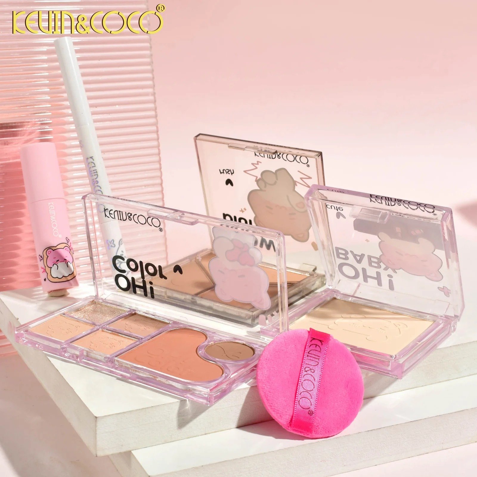 Set de maquillaje que contiene una paleta de sombras distribuidas en mate y satinadas de alta pigmentación y fácil difuminado, un polvo compacto, una paleta de contornos en polvo, un brillo labial con color y un gel de cejas transparente.