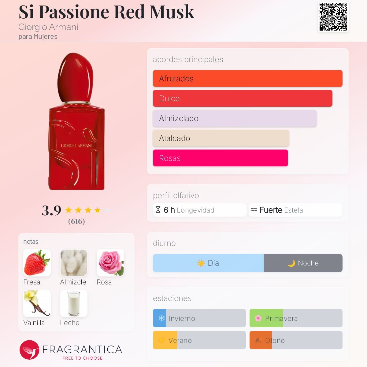 Sí Passione Red Musk de Giorgio Armani es una fragancia femenina lanzada en 2025, perteneciente a la familia Floral Frutal. Es un perfume moderno, dulce y envolvente, con un perfil cremoso y sensual donde el almizcle es protagonista. Su apertura combina fresa y almizcle, logrando un inicio jugoso y suave. En el corazón, la rosa y la leche aportan un toque delicado, cremoso y femenino. Finalmente, el fondo de almizcle y vainilla deja una estela cálida, adictiva y muy reconfortante.