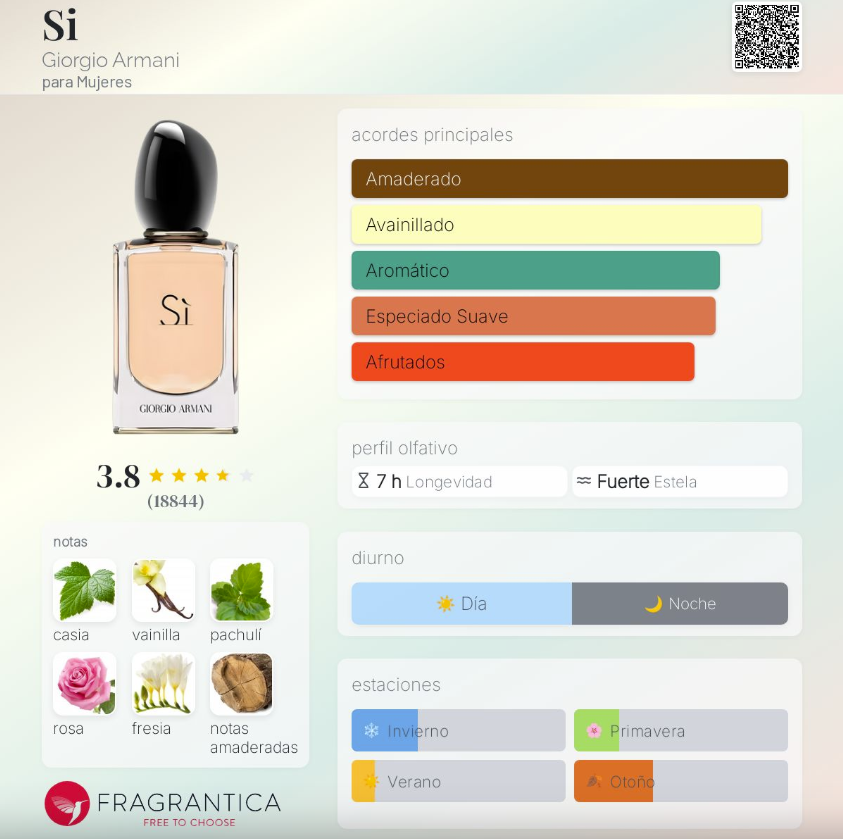 Sí de Giorgio Armani es una fragancia femenina lanzada en 2013, perteneciente a la familia Chipre Frutal. Creada por la perfumista Christine Nagel, es un perfume elegante, sofisticado y profundamente femenino. Su apertura se centra en el casis, una nota jugosa y ligeramente oscura que aporta un toque moderno y distintivo. En el corazón, las flores —rosa de mayo y fresia— brindan suavidad, romanticismo y equilibrio. Finalmente, su base cálida y envolvente combina vainilla, pachulí, maderas y ambroxan, creando una estela dulce, cremosa y muy sensual.