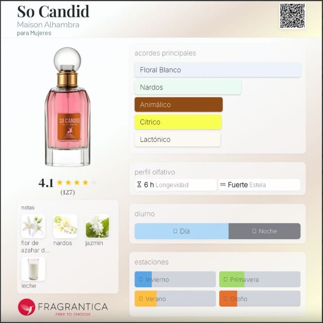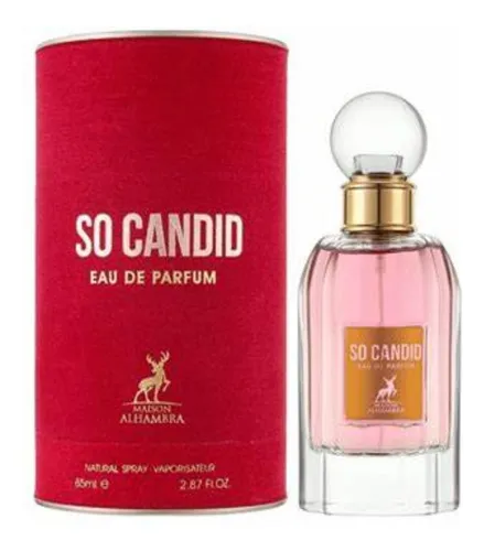 So Candid de Maison Alhambra es una fragancia femenina lanzada en 2022, perteneciente a la familia Floral. Inspirada en So Scandal! de Jean Paul Gaultier, esta esencia recrea su carácter sensual, elegante y ultra femenino. Su composición combina la luminosidad de la flor de azahar con un corazón intenso de nardos y jazmín, envueltos en un fondo cremoso de leche que aporta suavidad y calidez. El resultado es un perfume sofisticado, adictivo y envolvente, ideal para mujeres seguras que disfrutan destacar con un aroma dulce y floral.